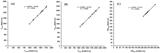 (A–C) The results of linear regression analysis for the main profile parameters of the profiles derived from the best sprint and calculated with model II for the different series driven with different gear ratios. (A) Theoretical maximal mean pedal force Fmax; (B) maximal power output Pmax and (C) theoretical maximal pedalling rate PRmax.