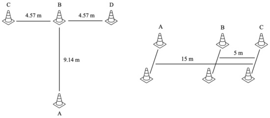 For the t-test drill (Figure 1), the athlete started at cone A. On the coach’s command (i.e., 3-2-1-go), the athlete sprinted straight toward cone B and touched the tip of the cone with the right hand. The height of the cone was 30.48 cm. Then, the athlete shuffled sideways toward cone C, touched the tip of the cone with the left hand, and continued shuffling toward cone D. After touching cone D with the right hand, the athlete shuffled back to cone B, touching it with the left hand, and running backward toward cone A. The trial did not count if the athlete crossed the legs while shuffling and/or failed to touch the tip of each cone with the respective hand [4]. The stopwatch, measuring to the nearest tenth of a second, started on the “go” command and stopped when the athlete passed cone A.