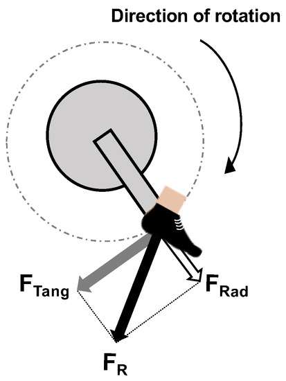 Principle of index of pedal force effectiveness. Resultant force (FR) applied in the plane of the crank; Tangential force (FTang) tangential to the crank displacement (effective force) and radial force (FRad) along the crank (ineffective force).