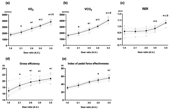 We first evaluated the effect of changing the gear ratio at a fixed cadence on the respiratory variables (VO2, VCO2, and RER), GE and IFE, during the five-stage graded cycling test (Figure 3). Both VO2 and VCO2 increased linearly as the gear ratio increased (Figure 3a,b). While RER at 2.1 and 2.6 of gear ratio (i.e., work rate = 139.9 and 187.3 W, respectively) did not significantly differ compared with the initial level (1.6 of gear ratio = 102.7 W of work rate), that was gradually increased when the gear ratio was more than 3.1 (Figure 3c). GE and IFE also gradually increased as the gear ratio increased (Figure 3d,e).