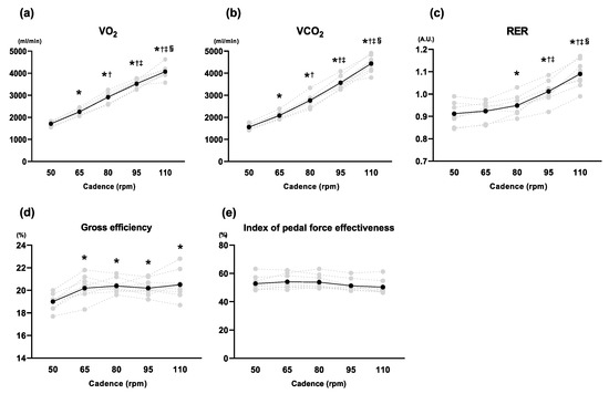 Changes in respiratory variables, gross efficiency, and index of pedal force effectiveness during multistage graded cycling test in the CADENCE trial. Data representing mean and individual values are presented as solid and dotted lines, respectively. (a) Oxygen uptake; (b) Carbon dioxide production; (c) Respiratory exchange ratio; (d) Gross efficiency; (e) Index of pedal force effectiveness. * p < 0.01 versus 50 rpm; † p < 0.01 versus 65 rpm; ‡ p < 0.01 versus 80 rpm; § p < 0.01 versus 95 rpm. n = 9.
