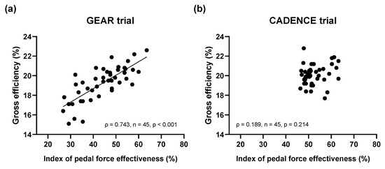 The Spearman’s correlation coefficient was used to examine the relationship between GE and IFE in each trial when the data were pooled. Briefly, in this study, these indices were assessed at five stages (GEAR trial:1.6, 2.1, 2.6, 3.1, and 3.5; CADENCE trial:50, 65, 80, 95, and 110 rpm) for nine participants; thus, the total number of plotted data would be 45. This analysis was based on previous studies that demonstrated that improvements in GE were closely associated with IFE during incremental cycling tests [3,6,17].