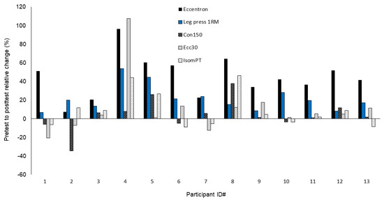 Means and standard deviations (SD), relative change scores, and ES values for all variables are presented in Table 1. For the Eccentron peak force, there was a training effect showing a significant increase (p < 0.001) and the Cohen’s d ES was large (0.86). The leg press measure also presented a significant increase (p < 0.001) and the ES was moderate (0.48). All single-joint variables including IsomPT, Ecc30, and Con150 did not show significant improvements (p = 0.16–0.81), but the ES values for IsomPT and EccPT30 suggest a small training effect (ES = 0.29 and 0.20, respectively) was present. Con150 was the only variable to show no training effect based on the Cohen’s d ES (0.04). Figure 1 shows the mean relative change scores across all muscle strength variables for each participant. Supplement Tables S1 and S2 present the data stratified by sex.