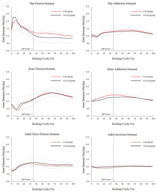 The peak joint angles and moments of the supporting legs in the lower extremities are shown in Table 2 and Table 3. The peak knee adduction moment was significantly greater in the CAI group than that in the N-CAI group (1.30 ± 0.58 vs. 0.86 ± 0.39 Nm/kg, p = 0.049). There were no significant differences in the other variables during the kicking cycle between the CAI and N-CAI groups (p > 0.05). The joint moment curves of the CAI and non-CAI groups during the kicking cycle are shown in Figure 1. No between-group differences in the lower extremity joint moments were observed at any time point during the kicking cycle (p > 0.05).