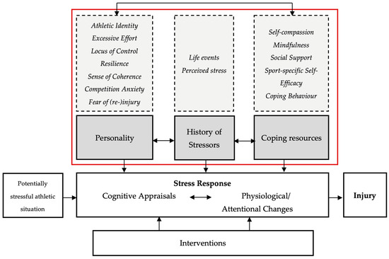 Personality characteristics are an additional pillar in the Model of Stress and Athletic Injury [21]. Such personality characteristics include, for example, locus of control, sense of coherence, hardiness, and competitive trait anxiety, which influence the stress response of athletes and thus the risk of injury. In a recent meta-analysis by Ivarsson et al. [15], however, personality factors had a negligible relationship with injury rates. Yet, depending on the outcome and measurement tools used, the study results are mixed with some evidence underlining the influence of (competitive) anxiety on the injury risk of athletes [56,57,58]. The results are also mixed for locus of control: there are studies that demonstrate an association between locus of control and (risk of) sports injuries [59,60] and studies that find no evidence for this [61]. Hardiness and the related concept of resilience are especially important after injury, as they can make it easier to deal with sports injuries, with people being more resilient and showing more hardiness being better able to cope with an injury and staying motivated during the rehabilitation process [62]. However, hardiness has also been investigated prior to an injury hypothesizing that people being hardier sustain less injuries [63]. Furthermore, sense of coherence has been investigated scarcely in relation to sports injuries [21]. However, in a cross-sectional study, sense of coherence was negatively associated with lay-offs due to overuse injuries in young female athletes [64]. Additionally, sense of coherence seems to play an important role in maintaining mental health after an injury [31]. In addition to the personality factors stated in the Model of Stress and Athletic Injury, several others have been investigated and related to injury risk and occurrence in the past years. For example, athletic identity and excessive effort seem to be related to injury risk with higher athletic identity [65] and higher excessive effort [28,66,67] being risk factors for injury.