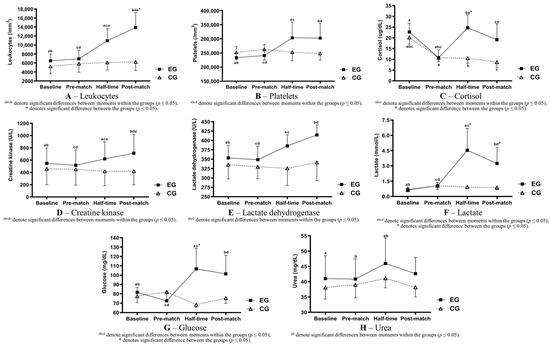 The total leukocyte count was significantly higher between moments and groups (EG baseline: 6470 ± 1541; EG post-match: 13,890 ± 3292; Figure 1A). Platelets showed similar behavior, with significant differences between moments (EG baseline: 233,300 ± 39,497; EG post-match: 302,400 ± 52,073; Figure 1B); however, no differences between the groups were found. Cortisol showed a significant increase for the half-time and post-match stages, compared with the pre-match stage, for the EG, even though the measurements for the post-match stage were significantly lower than the half-time stage (pre-match: 10.78 ± 3.63; half-time 24.70 ± 6.04; post-match: 19.15 ± 7.40; Figure 1C). Between the groups, the only moment with differences compared with the CG was at half-time.