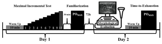 We carried out a cross-sectional study to understand if quadriceps morphology and quality, and VL muscle architecture, are determinants of maximal isometric knee extensor torque and of crank torque during TTE performance. Each cyclist visited the laboratory on two occasions (Figure 1). During the first visit, anthropometric data were assessed, and cyclists performed a maximal incremental test and familiarization to maximal TTE. After a week, athletes returned for the second visit. Muscle morphology (estimated MV; CSA), muscle quality (ECHO) and VL muscle architecture of both the left and right quadriceps’ muscles were assessed. After that, cyclists performed three knee extensor MVICs with both lower limbs. Finally, cyclists performed a maximal TTE at maximal power output (POMAX) with measured CT. This study was conducted according to the Declaration of Helsinki, and all procedures were approved by the local Institutional Research Ethics Committee (project number 708.362). All cyclists were informed of the benefits and risks of the investigation prior to signing an institutionally-approved informed consent document to participate in the study. Before each visit, subjects were instructed to avoid strenuous exercise and alcohol consumption within the last 48 h and to consume no caffeine or food during the final 3 h before each test. The athletes participating in the present study had 5.8 ± 6.6 years of regular training/competition and no history of lower limb muscle-skeletal injuries. Exclusion criteria included chronic disease, smoking, metabolic disorders, use of steroids in the last six months, chronic disease, physical disabilities, smoking, and use of antibiotic drugs in the previous week.
