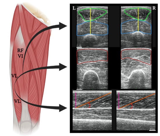 Illustration of left (L) and right (R) quadriceps muscle architecture. Both upper images represent the cross-sectional area (CSA) of the rectus femoris muscles—RF (green line), vastus intermedius—VI (blue line) and muscle thickness of the RF and VI muscles (yellow line) for later calculation of muscle volume (MV). Both middle images represent the CSA of the vastus lateralis—VL (brown line). Both inferior images represent the VL muscular architecture. The superior and inferior aponeuroses are represented by the white lines, while the muscular fascicle length (FL) is represented by the orange line, the pennation angle (PA) by the red line, and muscle thickness (MT) by the pink line. All analyses were performed using ImageJ 1.42q software (National Institute of Health, Bethesda, MD, USA).