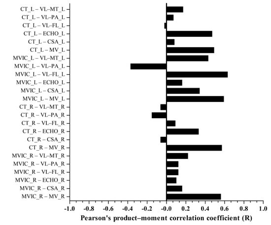 Right (R = 0.56) and left (R = 0.59) quadriceps MV presented very large positive correlations with right and left MVIC, respectively (p < 0.05). Furthermore, right (R = 0.57) and left (R = 0.49) quadriceps MV presented very large and large positive correlations with right and left CT, respectively (p < 0.05). In addition, left quadriceps ECHO (R = 0.47) presented large positive correlation with left CT, and left VL-FL (R = 0.63) presented very large positive correlation with left MVIC (p < 0.05) (Figure 3).