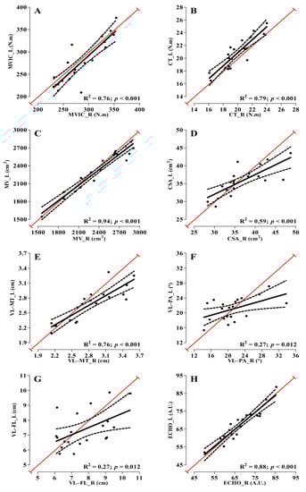 Between-sides simple linear regressions (black line) for the following variables: (A) knee extensors maximal voluntary isometric contraction (MVIC); (B) crank torque (CT); (C) quadriceps muscle volume (MV); (D) quadriceps cross-sectional area (CSA); (E) vastus lateralis muscle thickness (VL-MT); (F) vastus lateralis pennation angle (VL-PA); (G) vastus lateralis fascicle length (VL-FL); and (H) quadriceps echo intensity (ECHO). Red line represents perfect linear relationship between sides for each variable.