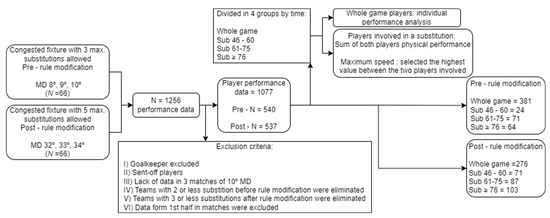 Taking into account the distribution used in the literature, substitutions were classified into 15 min temporal windows [26,27]. Solely the changes made in the second half were considered for this study, as those made in the first half did not present a representative sample (n = 8). Therefore, the following groups were established: whole game players (full match); sub 46–60 (substitution between 46 and 60 min); sub 61–75 (substitution between 61 and 75 min); and sub ≥ 76 (substitution from minute 76 onwards). Furthermore, substitutions during the halftime rest were considered in the sub 46–60 window. To estimate physical performance, those players who played the whole match were analysed individually. However, when a substitution was carried out, a single-match player was considered as the sum of both players, i.e., the player who started the game and the one who replaced him. In consequence, performance variables were calculated by adding up both players’ data, except for the maximum speed, which was calculated by taking the higher value of both players. The data collection and cleaning process is illustrated in Figure 1.