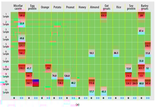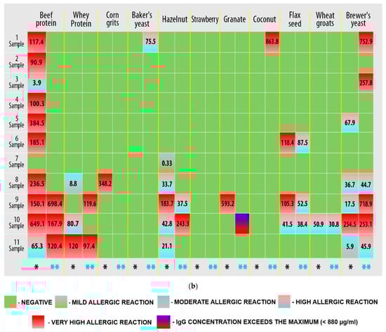 Figure 1 shows that hyper-reactive reactions to food allergens are personalized, and changes in the immunological response must be assessed individually. However, a response to micellar casein (samples 1, 2, 4–6, and 8) and leveling (samples 1–6 and 8) and a decrease (sample 10) in the response to beef protein can be observed after exercise.