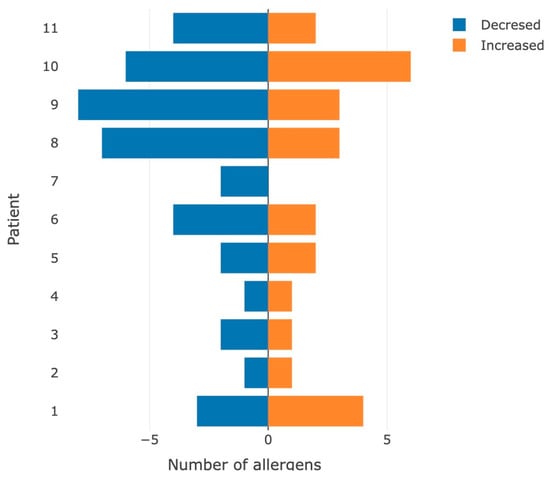 Number of allergens for which the appearance/increase (orange color) or leveling/decrease (blue color) in the immunological hyperactive reaction was detected after performing the stress test.