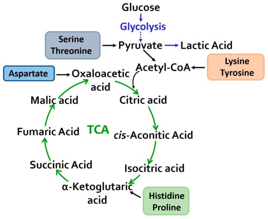 An increase in the level of amino acids involved in the conversion of pyruvate–serine and threonine and a decrease in the concentration of lysine and tyrosine, which enter an oxidation reaction with the formation of acetyl-CoA, directly feed the TCA cycle. Tyrosine may also be an indicator of exercise-induced adaptation and increased physical activity [24,25,26].