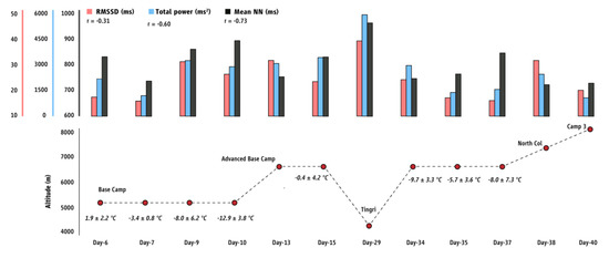 During the night inside the tent, the air temperature ranged from −12.9 to 1.8 °C (−5.8 ± 4.9 °C) and the relative humidity ranged from 26.1 to 78.9% (50.7 ± 16.9%). Awakenings were very frequent during the recorded sleeping patterns. For every hour of night-time sleep, the average awake time ranged from 9 to 26.5% (17.1 ± 6.0%) and was linearly associated with altitude (r = 0.42). The heart rate data recorded during awakening were not included in the HRV analysis. We found that the altitude level was positively correlated with the resting heart rate (r = 0.70) and negatively correlated with oxygen saturation (r = −0.94) (Figure 1). After removing all of the awakening time, the average time used for the HRV analysis was 226.8 ± 97.1 min ranging from 117.5 to 455.0 min and was negatively associated with altitude (r = −0.51). Additionally, altitude reduced the mean ΝΝ during sleep (r = −0.73; Figure 2), which was 813.0 ± 42.3 ms at 5400 m (BC; Day 6) compared to 948.2 ± 69.4 ms at 4348 m (Tingri; Day 29). The same was also observed for the other parameters of HRV [RMSSD (r = −0.31); total power (r = −0.60); LF/HF ratio (r = −0.40); Poincaré SD1 (r = −0.31); Poincaré SD2 (r = −0.70); Poincaré SD1/SD2 (r = −0.24)]. Subjective sleep quality deteriorated while ascending at higher altitudes (r = 0.89; higher SSS scores indicate lower subjective sleep quality), being high (1.2 ± 0.4 in the SSS, indicating feeling active, vital, alert, or wide awake during the day) at altitudes 4348–5440 m, moderate (2.2 ± 0.4 in the SSS, indicating functioning at high levels, but not fully alert during the day) at 6340 m, and low (4.0 ± 2.1 in the SSS, indicating being somewhat foggy, or let down during the day) at altitudes 7050–8300 m. Acclimatization to altitude at 5400 m (BC; days 7–10) and at 6340 m (days 13–15 and 34–37) increased the mean NN (average change: 76.44 ± 17.72 ms). This also correlated with subjective sleep quality, which improved during habituation at specific altitudes (i.e., SSS scores were higher on the first day at a given altitude, compared to subsequent days at the same altitude).