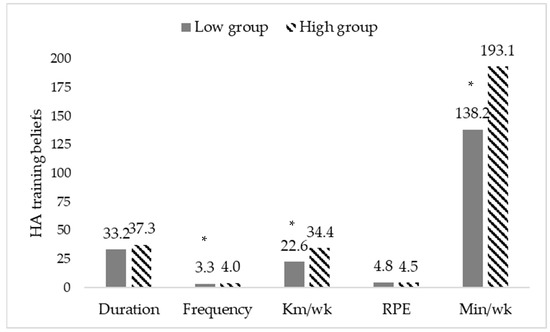 While 30.4% of participants correctly identified approximately half of the true and false statements related to HA benefits, only 11.2% of participants correctly identified all seven true and false HA benefit statements. These findings were further reflected in the participants opinions on HA protocols, with almost half (48.8%) of the runners responding that runners should not follow an HA protocol during the summer season. Significant differences were present by training status, with the low group perceiving less training frequency, km/wk, and min/wk as appropriate for HA purposes (see Figure 1).