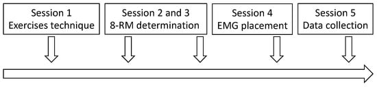 The present investigation was designed as a cross-over, repeated-measures, within-subject study and was conducted in line with previous studies from our laboratory [13,24,25,26,27,28]. The participants were involved in five different sessions (Figure 1). The sessions were dedicated to the familiarization with the exercise variations (session 1), the determination of the 8-RM for the biceps curl performed using the supinated, pronated, and neutral handgrip (sessions 2–3), and the placement of the electrodes (session 4). In the fifth session, the muscles’ maximum excitation was first measured, and after a 30-min passive recovery, the participants performed a non-exhaustive set for each exercise in a random order, with 10 min of inter-set rest. Each session was separated by at least three days, and the participants were instructed to avoid any further form of resistance training for the entire duration of the investigation.