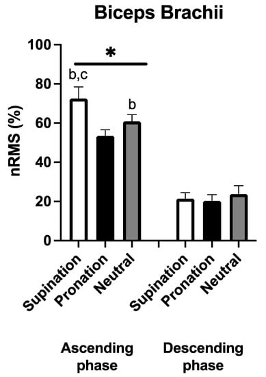 Average (N = 10) normalized root mean square (nRMS) for the biceps brachii during the three different handgrips in the ascending and descending phase. b: p < 0.05 vs. pronation, c: p < 0.05 vs. neutral, *: p < 0.05 vs. the descending phase.