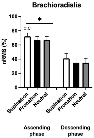 Average (N = 10) normalized root mean square (nRMS) for the brachioradialis during the three different handgrips in the ascending and descending phase. b: p < 0.05 vs. pronation, c: p < 0.05 vs. neutral, *: p < 0.05 vs. the descending phase.