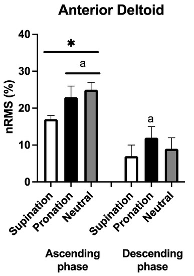 Average (N = 10) normalized root mean square (nRMS) for anterior deltoid during the three different handgrips in the ascending and descending phase. a: p < 0.05 vs. supination; *: p < 0.05 vs. the descending phase.