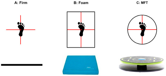 All participants initially started with a 15 s familiarization trial on the foam pad and the balance board without instruction or feedback. Then, on each foot, volunteers performed three 60 s balancing trials barefooted on three different support surfaces: a firm surface, a foam pad, and an MFT Challenge Disc. The order of the tests (right foot–left foot/left foot–right foot) and the order of the surface conditions were randomized. Three trials of balancing were conducted for each foot and each surface.