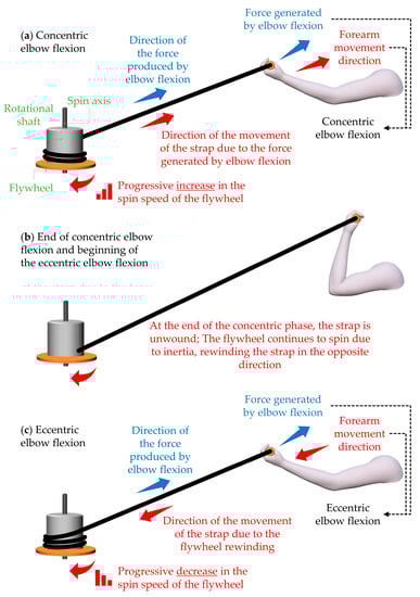 This figure shows a graphical illustration of a functioning flywheel device. An elbow flexion exercise was considered in the example: (a) concentric elbow flexion; (b) end of concentric elbow flexion and beginning of eccentric elbow flexion; (c) eccentric elbow flexion.