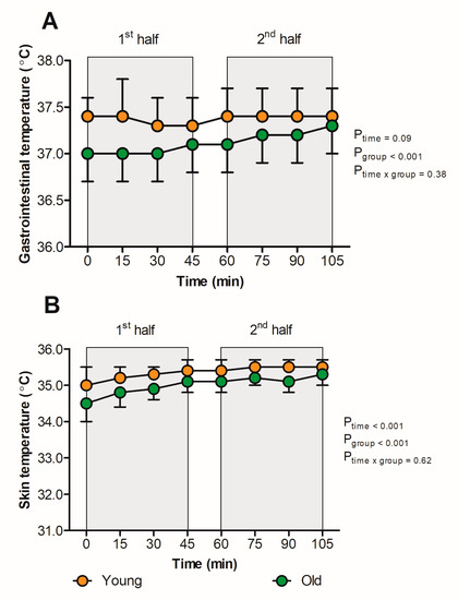 Responses of Tgi (A) and Tskin (B) in young (<50 years; orange icons) versus old (≥50 years, green icons) individuals while spectating a football match in hot and humid conditions. In short, Tgi and Tskin were significantly higher in the young versus the old group, whereas the change in Tgi and Tskin over time did not differ between groups. Data were presented as the mean ± SD.