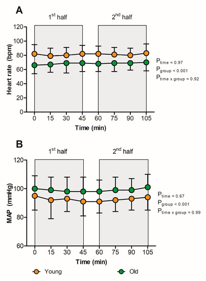 It has been shown that cutaneous vasodilation, thermal sensitivity, sweat rate, and the redistribution of blood from internal organs are blunted in the elderly during passive heat exposure [46,47]. Given these age-related decrements in the capacity to dissipate heat [26], we expected to see exaggerated thermoregulatory and cardiovascular responses (i.e., Tgi, Tskin, HR, and MAP) in the older group. However, although we did observe a significantly higher Tskin in younger individuals, the observed thermoregulatory and cardiovascular responses in our study were not affected by age. The absence of any age-related impact on our study outcomes is most likely because the overall thermoregulatory and cardiovascular strain was already limited. Further, older individuals are more likely to have health issues (e.g., cardiovascular and renal diseases), which further compromise thermoregulation [48], but our study consisted of a relatively healthy group of older individuals.