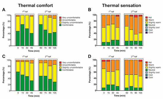 The link between perceptual outcomes and thermal strain is well established. At a normothermic core temperature (~37 °C), thermal sensation and thermal comfort are largely determined by Tskin [41,42,43], whereas thermal comfort might also be modulated by skin wettedness [43,44,45]. We found a progressive increase in Tskin, with peak values of 35.4 ± 0.3 °C at the end of the match. This increase in Tskin may explain the parallel observation of significant perceptual strain, as 63% of participants reported thermal discomfort and 88% a (slightly) warm thermal sensation at the end of the match.