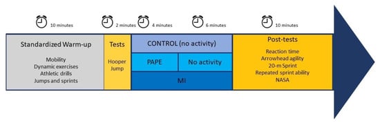 19]. However, the acute effects of these two strategies implemented within a comprehensive warm-up on activity-specific tasks remain to be clarified. Therefore, the aim of this present study was to investigate the acute efficiency of different comprehensive warm-up routines, emphasizing peripheral (PAPE) or central (MI) contribution to some sport-specific tasks. We, therefore, compared a traditional warm-up to the same standardized warm-up associated with either PAPE or MI on agility, sprint, repeated sprint ability, reaction time, and subjective fatigue. We hypothesized that PAPE and MI warm-ups would be more efficient than a traditional warm-up. Since both PAPE and MI warm-ups are applicable in real-world settings, this study will provide helpful knowledge to practitioners and coaches for warm-up optimization.