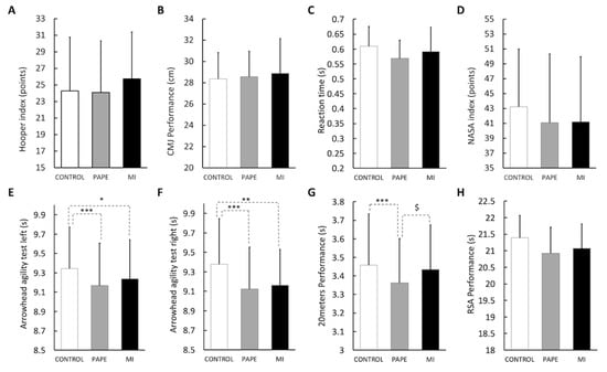 Baseline values for the CMJ and Hooper questionnaires did not show any significant differences between conditions. CMJ height for CONTROL, PAPE, and MI were 28.3 ± 2.4 cm, 28.5 ± 2.3 cm, and 28.8 ± 3.3 cm, respectively (p = 0.226, ηp2 = 0.143, small). Hooper values for CONTROL, PAPE, and MI were 24.2 ± 6.5, 24.0 ± 6.2, and 25.7 ± 5.6, respectively (p = 0.464, ηp2 = 0.074, small). For post-tests, the one-way ANOVA did not show any significant differences for the reaction time (p = 0.185, ηp2 = 0.075, small) nor for the NASA-TLX questionnaire (p = 0.314, ηp2 = 0.109, small). In contrast, significant warm-up effects were observed for the arrowhead agility test left side (p = 0.002, ηp2 = 0.579, medium), arrowhead agility test right side (p < 0.001, ηp2 = 0.597, medium), 20 m sprint (p = 0.002, ηp2 = 0.561, medium), and RSA (p = 0.008, ηp2 = 0.454, small).