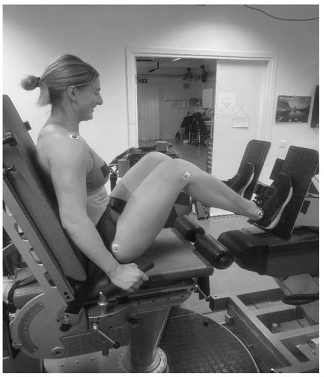 Thirteen female elite-level ice hockey players (age 21.5 ± 5.1 years, body height 167.6 ± 4.1 cm, body mass 66.3 ± 8.0 kg) volunteered to participate in the study and all participants completed all trials. The participants were highly trained elite ice hockey players from the highest ice hockey league in Sweden, one of the highest-ranked leagues in the world. They were only recruited if they had an average weekly training volume of 8–10 training sessions and included countermovement jump and maximal strength training for the lower limbs (>80% of 1 RM) as a part of their normal training routine. All participants were familiarized with the test protocol by performing three familiarization sessions before the intervention. To minimize the impact of the menstrual cycle on performance, none of the participants performed any of the experimental sessions during the ovulation phase of the menstruation cycle as this period seems to affect isometric maximal strength performance []. The participants were fully informed about the study, risks, and benefits of participation, made a health declaration, and provided their written informed consent before participation. The study was approved by the Regional Ethical Review Board in Stockholm (Dnr 2022/01818-01) and performed according to the principles outlined in the Declaration of Helsinki.