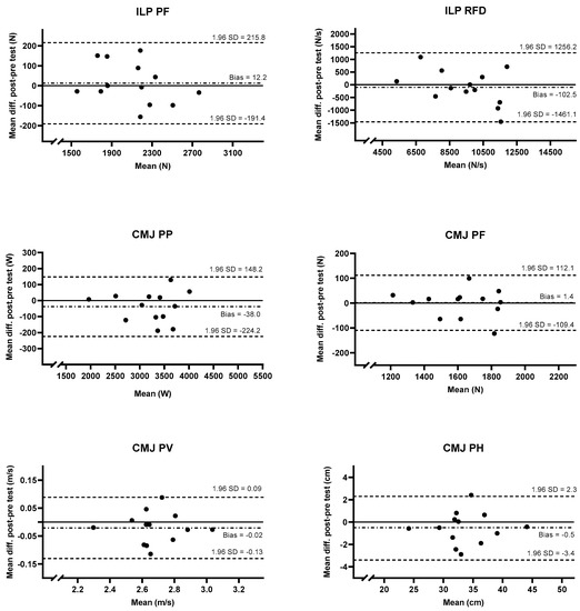 Bland–Altmann plots presenting test–retest for ILP PF, ILP RFD, CMJ PP, CMJ PF, CMJ PV, and CMJ PH using the best trial. The dashed line in the middle is the mean bias, and the upper and lower dashed lines are the upper and lower 95% LOA. The solid line is zero.