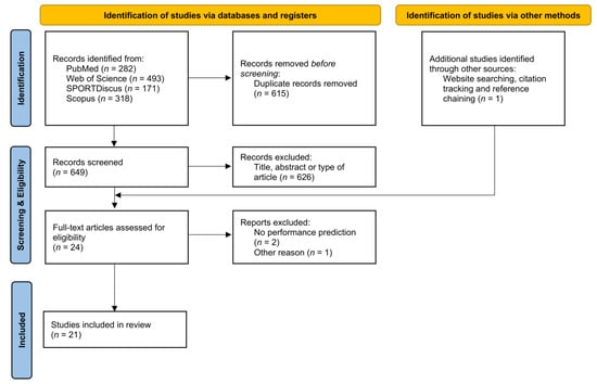 To analyze the findings of scientific literature regarding predictors of CrossFit® performance, a systematic literature search was conducted in accordance with the Preferred Reporting Items for Systematic Reviews and Meta-Analyses (PRISMA) guidelines [47,48]. In particular, this systematic review considers the question of what significant predictors of CrossFit® performance and performance improvement are. Therefore, the research question adheres to the Population, Intertest and Context (PICo) strategy to determine relevant studies to include [49].