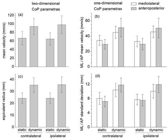 One-dimensional and two-dimensional center of pressure (CoP) parameters recorded during the SBD exercises executed in static and dynamic conditions, and in contralateral and ipsilateral variations: (a) Mean velocity; (b) Mediolateral and anteroposterior mean velocity; (c) Equivalent radius of excursion area; (d) Standard deviation of mediolateral and anteroposterior displacement.