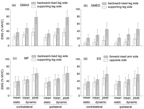 The GMAX and GMED activation was significantly higher at the side of the backward-raised lower limb (, , for GMAX, for GMED), ES activation was significantly higher at the side of the forward-raised upper limb (, , ), and MF activity was not significantly different between the sides of the body.
