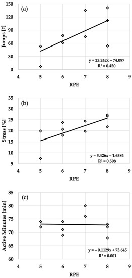 Relationship between subjective measure of internal load (rating of perceived exertion—RPE) and (a) Jumps, (b) Stress, and (c) Active Minutes external load metrics obtained from inertial measurement unit.