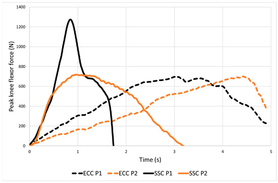 Illustration of the varying capacity of participants to utilize the stretch-shortening cycle (SSC) to enhance muscle performance. Participant 1 (black solid and dotted lines) demonstrated twice as much NHESSC peak knee flexor force as NHEECC, whereas for participant 2 (orange solid and dotted lines) peak knee flexor force was unchanged between NHE variations.