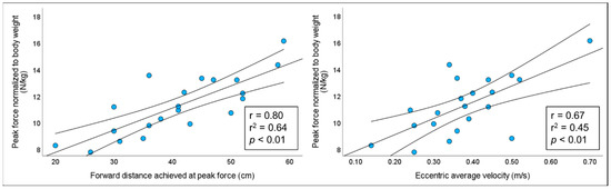 Illustration of correlations between hip forward distance achieved and eccentric average velocity with bilateral normalized peak knee flexor force during NHESSC in elite athletes (n = 21), along with the corresponding 95% confidence intervals.