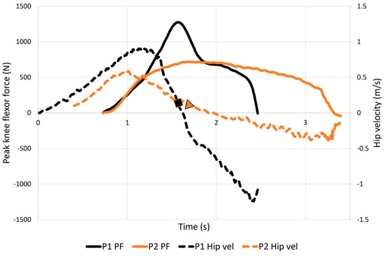 A chart with a primary axis representing peak knee flexor force (PF) and a secondary axis representing hip forward/backward velocity. It illustrates the change of velocity (acceleration and deceleration) during the stretch-shortening cycle (SSC) type NHE and its relation to peak knee flexor force for two of the participants. During the eccentric phase of the NHESSC, large acceleration and deceleration of the body (participant 1, black solid and dotted lines) resulted in higher peak knee flexor force than moderate acceleration and deceleration (participant 2, orange solid and dotted lines). Furthermore, it is noteworthy that peak knee flexor force was attained at the very end of the eccentric deceleration phase at almost zero velocity for both participants (as indicated by the black square and the orange triangle).