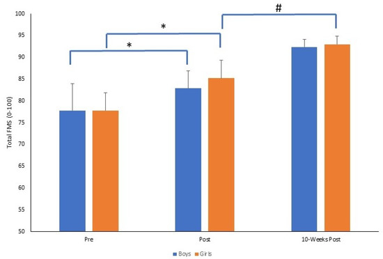 Figure 1. Mean ± SD of total FMS score (0–100) for boys and girls across time points (* p = 0.001, # p = 0.01).