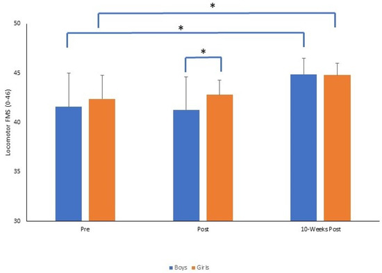 Figure 2. Mean ± SD of locomotor FMS score (0–46) for boys and girls across time points (* p = 0.001).