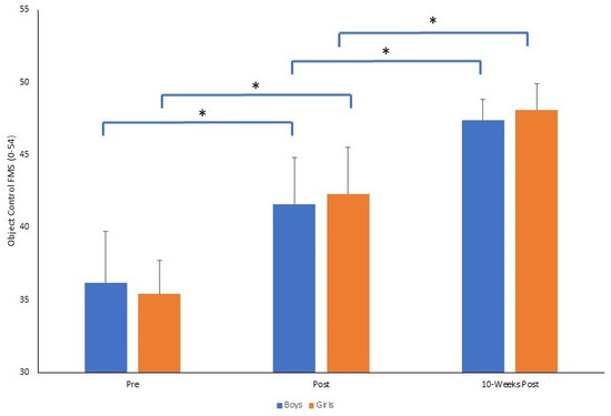Figure 3. Mean ± SD of object control FMS score (0–54) for boys and girls across time points (* p = 0.001).