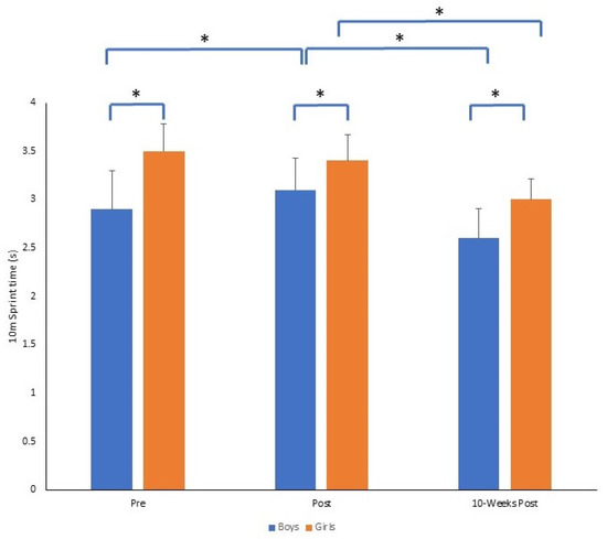 Figure 4. Mean ± SD of 10 m sprint time (s) for boys and girls across time points (* p = 0.001).