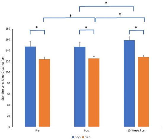 For standing long jump performance, there was also a significant time by gender interaction (F2,140 = 14.1, p = 0.001, pη2 = 0.168). At each time point, boys jumped significantly further than girls (all p = 0.001). Girls improved standing long jump performance from pre to post, and post to 10-weeks post (both p = 0.001), whereas boys did not improve pre to post (p = 0.367) but performed significantly better from post to 10-weeks post (p = 0.001). The magnitude of change was greater pre to 10-weeks post for boys (Δ = 11.7) compared to girls (Δ = 4.3). The mean ± SD of standing long jump distance (cm) for boys and girls across time points is presented in Figure 5.