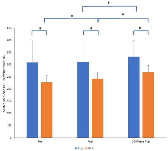 Figure 6. Mean ± SD of seated medicine ball throw distance (cm) for boys and girls across time points (* p = 0.001).
