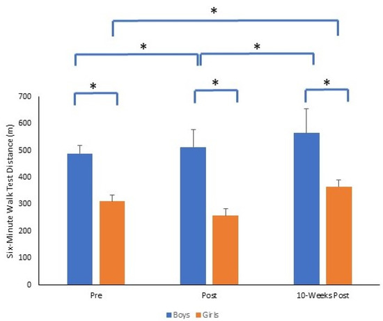Figure 7. Mean ± SD of six-minute walk test distance (m) for boys and girls across time points (* p = 0.001).
