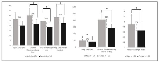 Male and female differences in fencing related fitness components adapted from Ntai et al. []. * = significant (p < 0.05), dashed line = percentage difference.