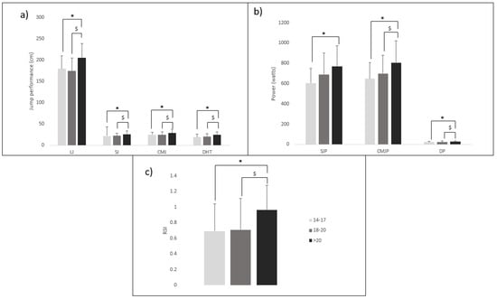 Age also impacts on leg power performance (Figure 2), where older fencers (>20 years) produced significantly higher values for long jump (LJ), squat jump (SJ), CMJ, drop jump (DJ), and reactive strength index (RSI) compared to younger age groups (14–17 and 18–20 years) []. More recently, Ntai et al. [] identified that the age of well-trained fencers also significantly affected specific fencing offensive kinetic patterns, such as lunge velocity (L), step-velocity (SL), and step backward step-lunge (SBSL), where older fencer groups (>20 years and 18–20 years) were faster than younger fencers (14–17 years). This highlights, once again, that fencing-specific adaptations are promoted during growth and maturation phases.