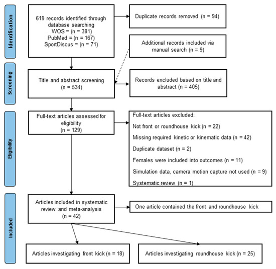Chicago/Turabian StyleVagner, Michal, Daniel John Cleather, Vladan Olah, Jan Vacek, and Petr Stastny. 2023. "A Systematic Review of Dynamic Forces and Kinematic Indicators of Front and Roundhouse Kicks across Varied Conditions and Participant Experience" Sports 11, no. 8: 141. https://doi.org/10.3390/sports11080141